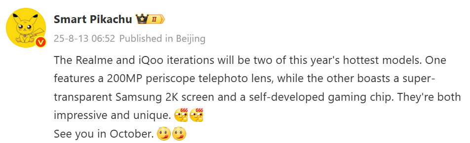 While many leaks focus on hardware numbers, Smart Pikachu’s latest post gives the iQOO 15 a touch of personality. In a playful teaser, the tipster called both the new Realme flagship and the iQOO 15 “two of this year’s hottest models,” noting that while Realme will flex a 200MP periscope telephoto camera, the iQOO 15’s bragging rights lie in a “super transparent” Samsung 2K display paired with a self developed gaming chip. The post ended with an emoji filled “See you in October,” which all but seals the deal for a mid-fall reveal.
