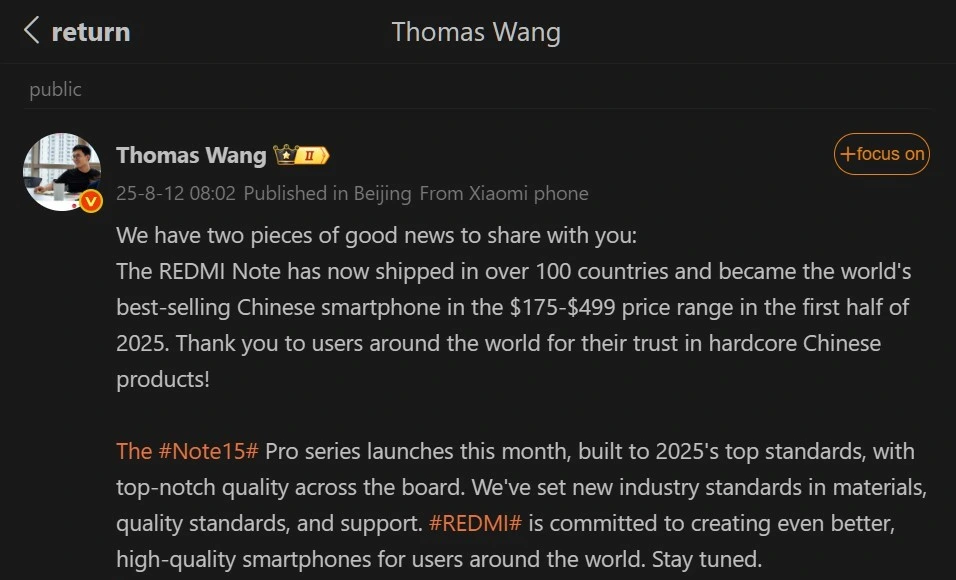 Xiaomi’s Redmi brand is kicking off August with serious momentum. Company executives confirmed that the Redmi Note lineup has now shipped to over 100 countries, earning the title of the world’s best selling Chinese smartphone in the $175–$499 segment during the first half of 2025. In China, it also led sales in the same price bracket, solidifying Redmi’s position as a dominant mid-range contender.
